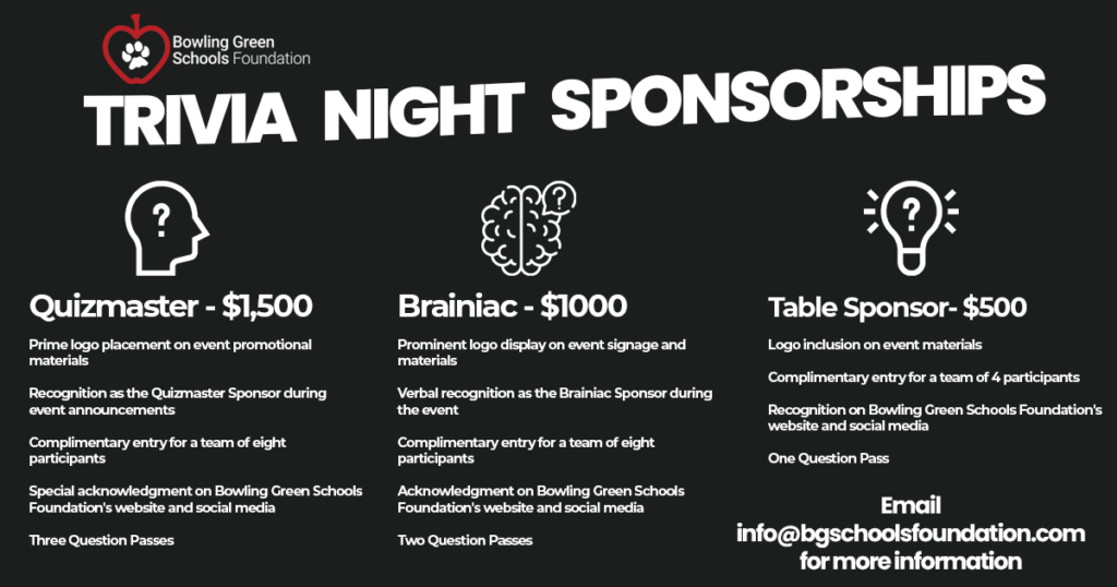 Proceeds from Trivia Night will directly benefit the students of Bowling Green Schools, helping to fund innovative programs, classroom resources, and scholarships. Your participation ensures our kids continue to thrive and achieve their full potential.